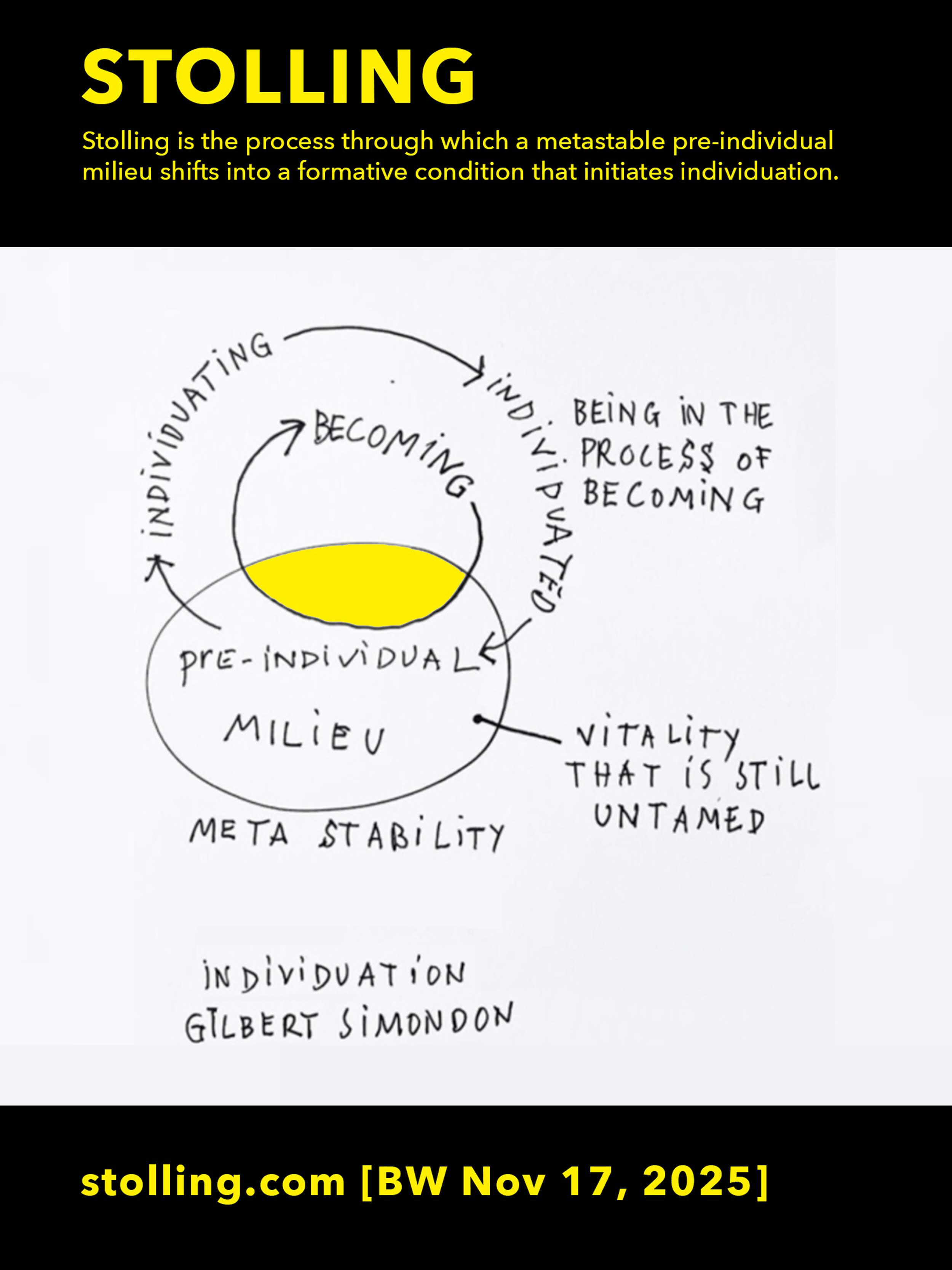 Stolling as an ArtworkStolling is an artwork that aims to shift and clarify the conditions of real life, in contrast to the representational life produced through identity-thinking. It intervenes in the zone where lived processes – material, psychic, social, ecological – are reduced to stable images, categories, and identities. Stolling acts on the level where forms become formable, before they are captured by representation.Stolling does not depict or symbolise this process; it enacts it. By naming the formative condition between potential and individuation, Stolling exposes a dimension of life that precedes identity, objecthood, and representation. It makes perceptible the real ontogenetic processes through which life emerges, differentiates, and continues to become.In this sense, Stolling is not merely a philosophical concept. It is a technotlogical artwork, a tool for restoring the dynamics of becoming that identity-thinking suppresses. It brings the pre-individual field back into experience, allowing the viewer – participant, citizen, thinker – to sense the movements, tensions, and openings that constitute real life beyond its captured representations. Stolling thus contributes to the unmaking of the representational order that dominates contemporary culture and reopens the conditions for a life that is lived, not represented.