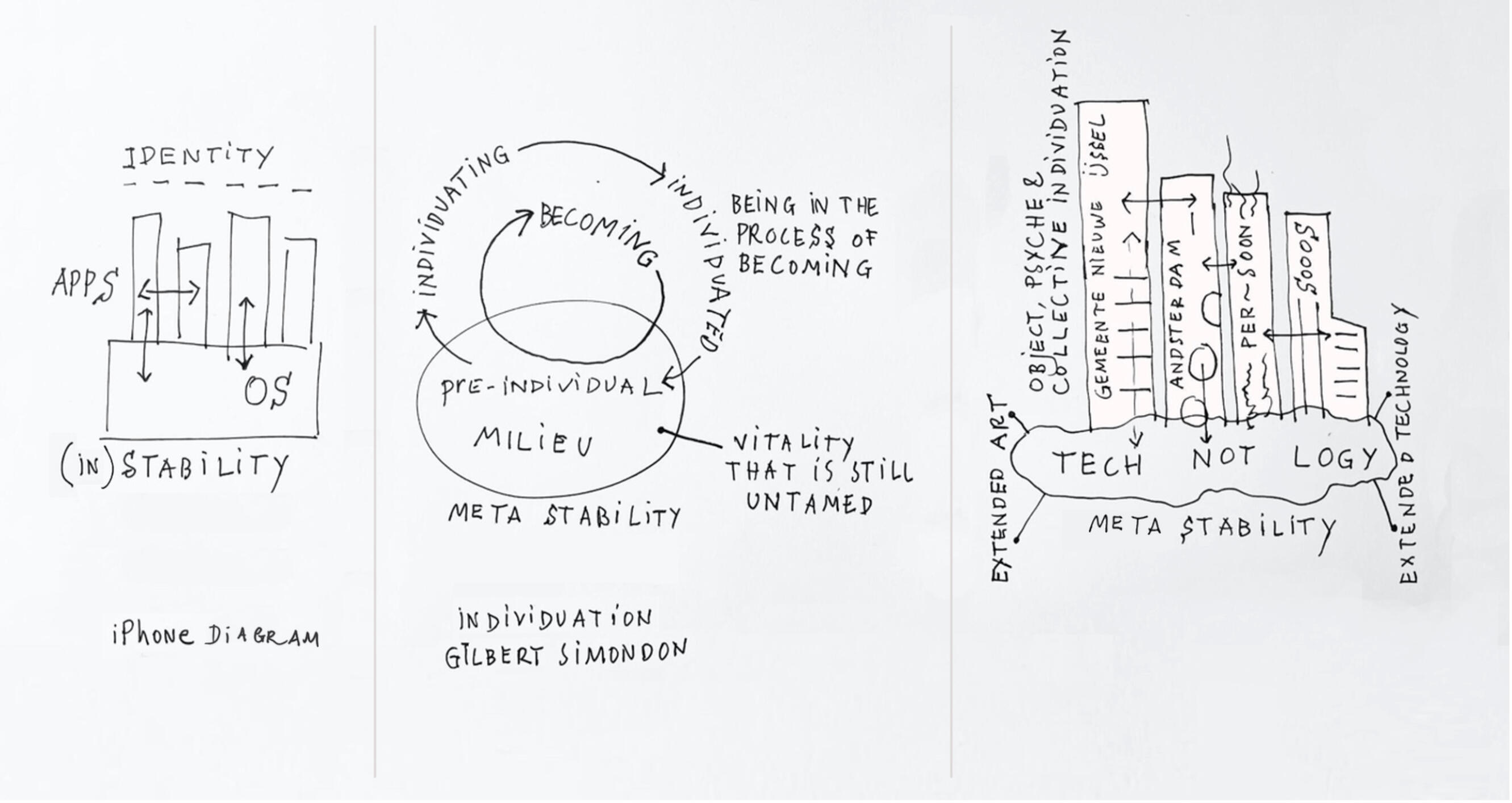 Johannes Bongers, Three diagrams [2023]. 1. The iPhone diagram: a model of how organisations, brands, and companies stabilise themselves through identity. 2. Individuation diagram Gilbert Simondon: how something comes into being from a metastable pre-individual milieu. 3. Technotlogy diagram: the merger of 1 and 2 into a living philosophical and affective concept of ongoing creative and political becoming: technotlogy.com
